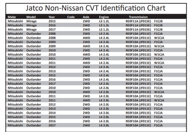 Les BVA des véhicules Mitsubishi sont manufacturées par le fabricant japonais Jatco, qui produit la moitié des boîtes CVT du marché mondial. Voici des exemples de boîtes Jatco rencontrées chez Mitsubishi :